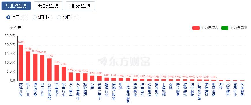 行业资金方面,截至收盘,软件开发、电力行业、通信设备等净流入排名靠前,其中软件开发净流入20.15亿。