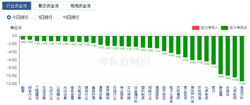 净流出方面,食品饮料、化学制药、半导体等净流出排名靠前,其中食品饮料净流出11.34亿元。