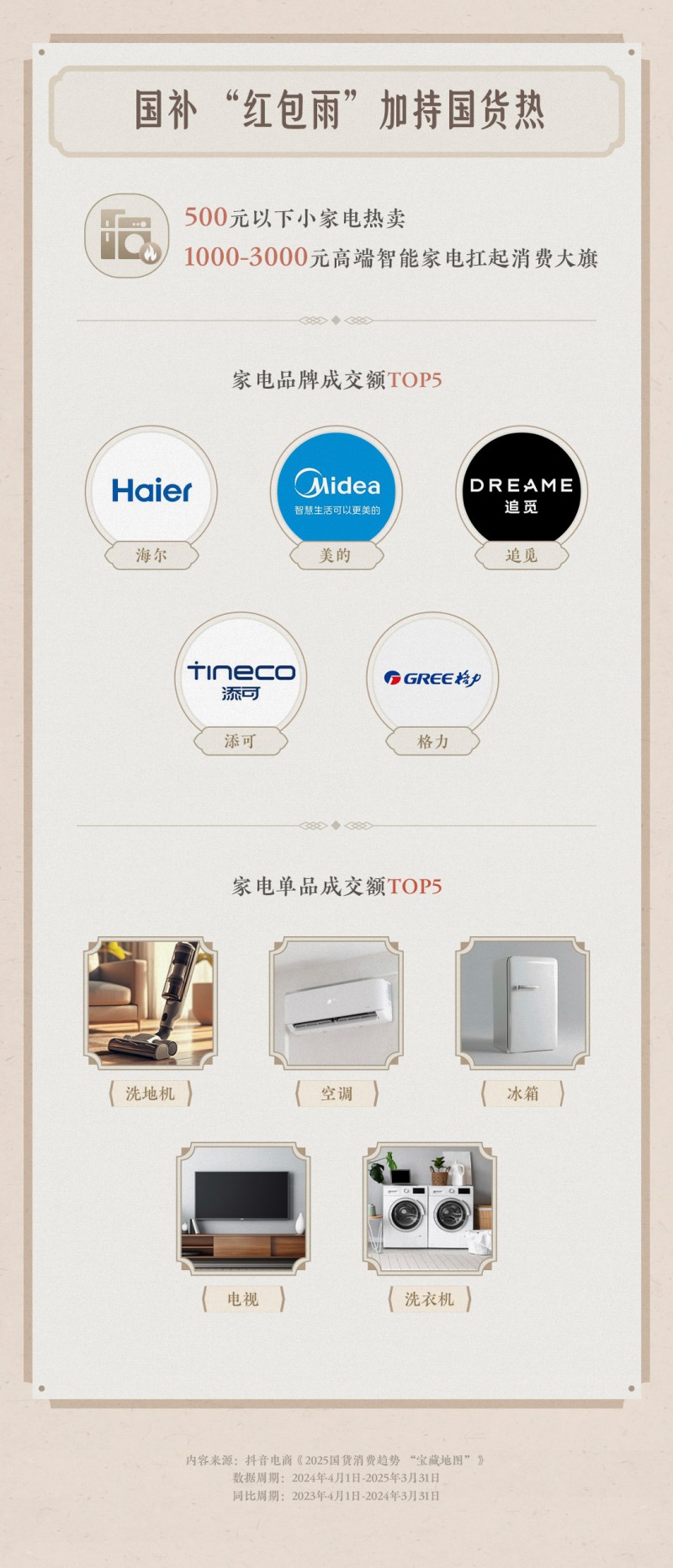 抖音电商数据显示,国补政策显著拉动国货家电品牌热销。500元以下的高性价比小家电因其实用性,受到众多消费者的青睐,成为家庭日常消费的热门选择;1000-3000元的高端智能家电凭借先进的技术和优质的体验,成为主销价格区间,反映出消费者对品质生活的追求。海尔、美的、追觅、添可、格力等国货品牌稳居家电热销榜单前列,展现出国补政策推动下国货生态全面升级的强劲势头。