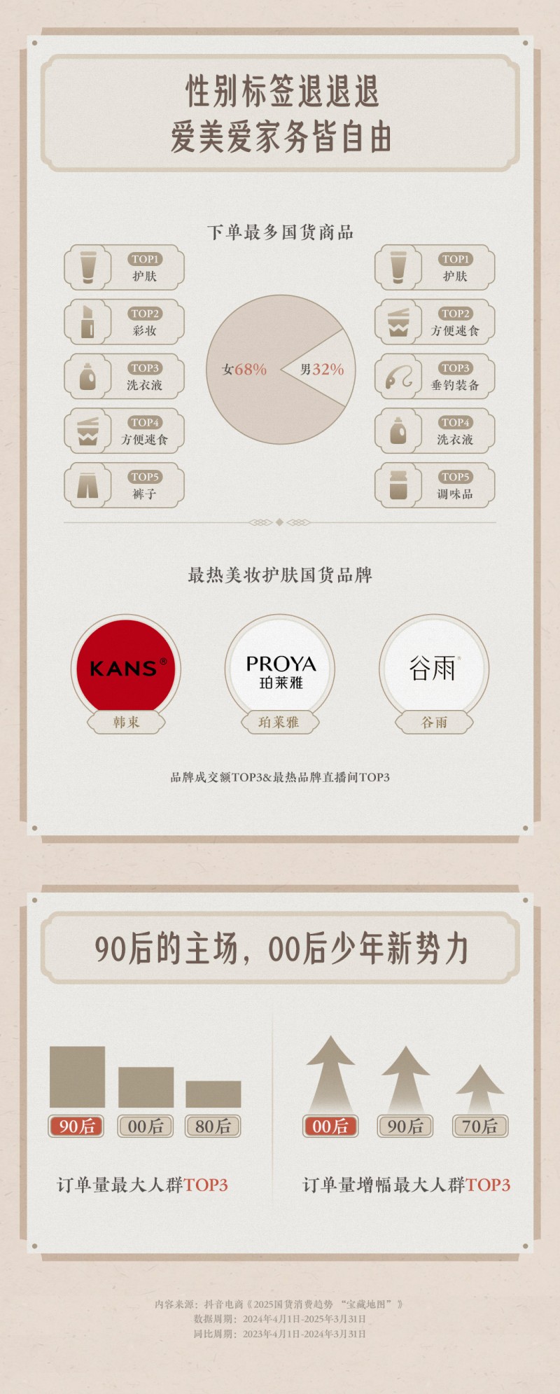 消费人群结构迭代特征明显,90后、00后已跃升为国货消费主力军,订单量稳居前二,其中00后订单增幅更是领跑各年龄段。值得关注的是,性别消费的边界正逐步消融,男女消费者在护肤、方便速食、洗衣液等品类的喜好渐趋一致。韩束、珀莱雅、谷雨等美妆品牌同时收获两性市场的认可,展现出国货消费的多元化潮流。