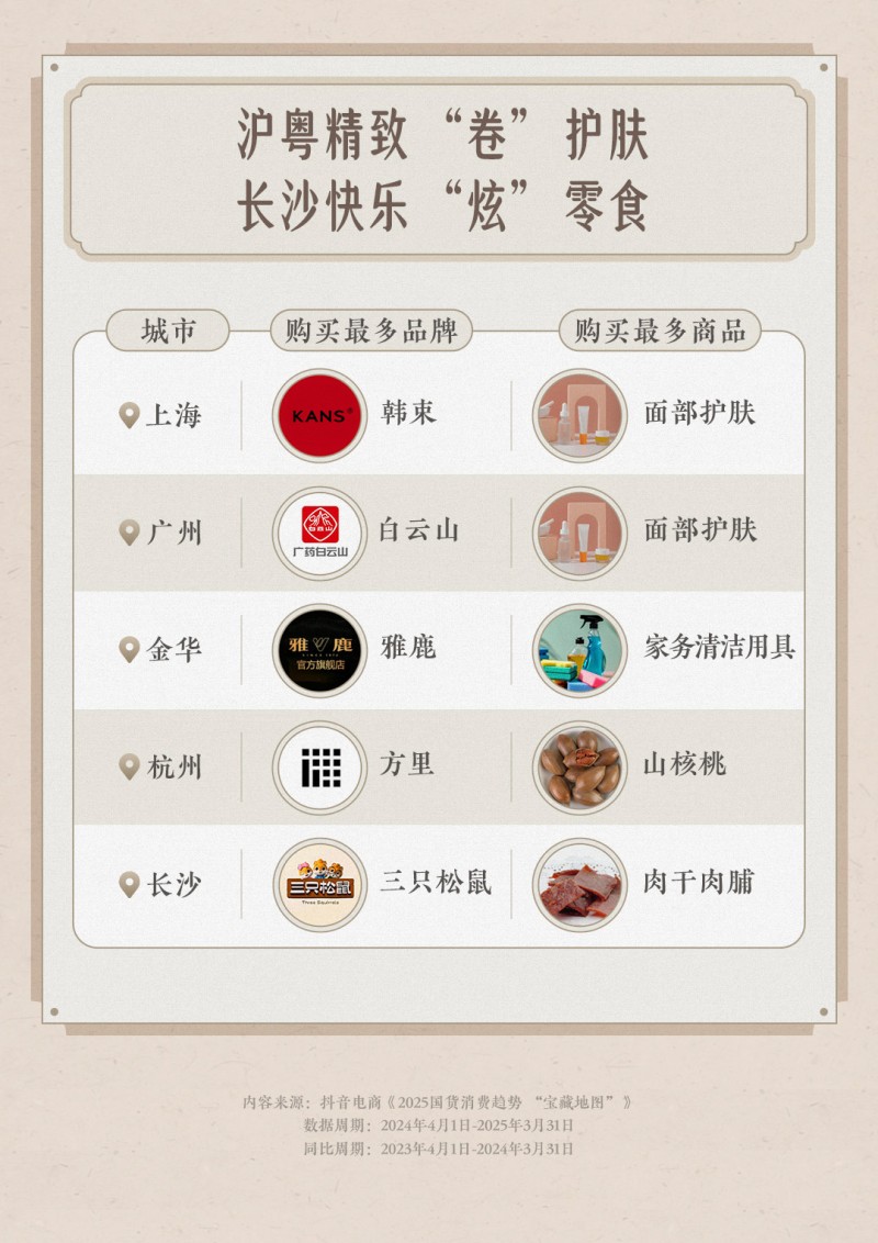 从地域维度看,消费偏好呈现显著差异化。在上海、广州等时尚前沿城市,护肤品的热度持续处于高位,白云山、韩束等国货品牌备受消费者喜爱;长沙则掀起 “炫零食潮”,以肉干肉脯为代表的零食十分热销。义乌成为家务清洁用品消费高地,而杭州消费者对本地特产山核桃的偏好程度则位居前列。